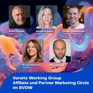 Am Gründungstag wurde der Vorsitz gewählt. Gemeinsam mit mir bilden Tim Lomborg (Awin), Annalena Bauer (easy Marketing), Nicole Schichtl (retailAds) und Florian Jetzlsperger (Acceleration Partners) den Vorsitz der Working Group.